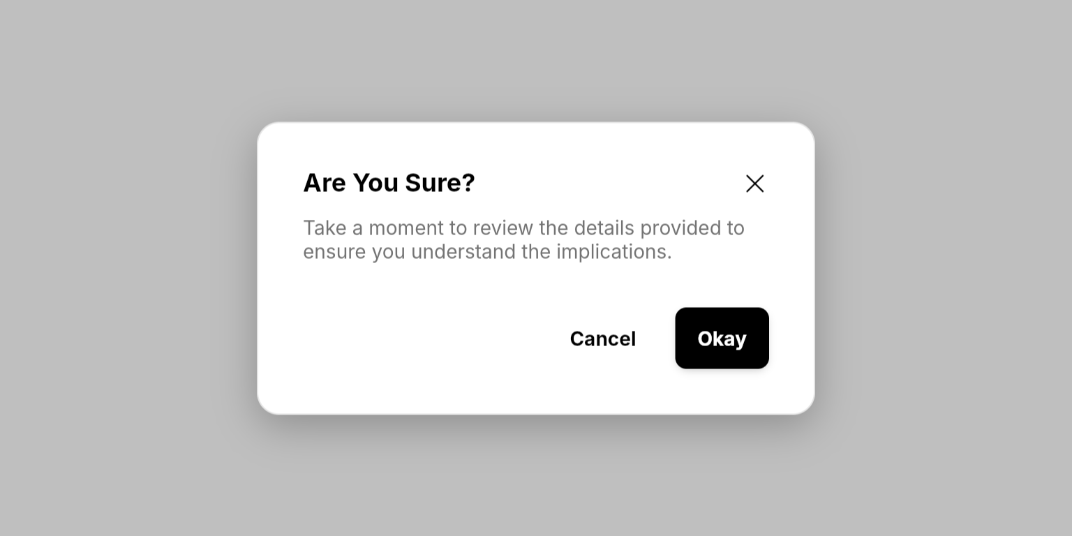 ) rather than a widget you place in your build tree. Use it for important interactions that require user attention—confirmations, forms, or critical information that must be acknowledged.Examples